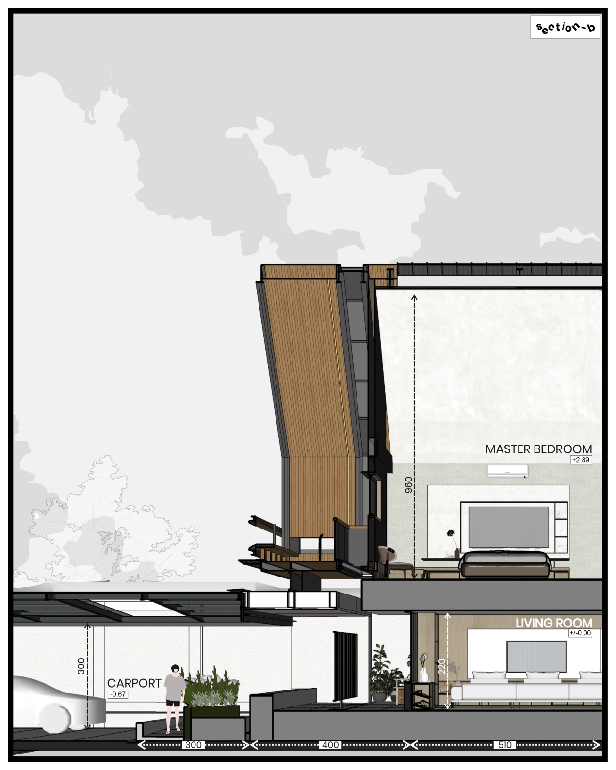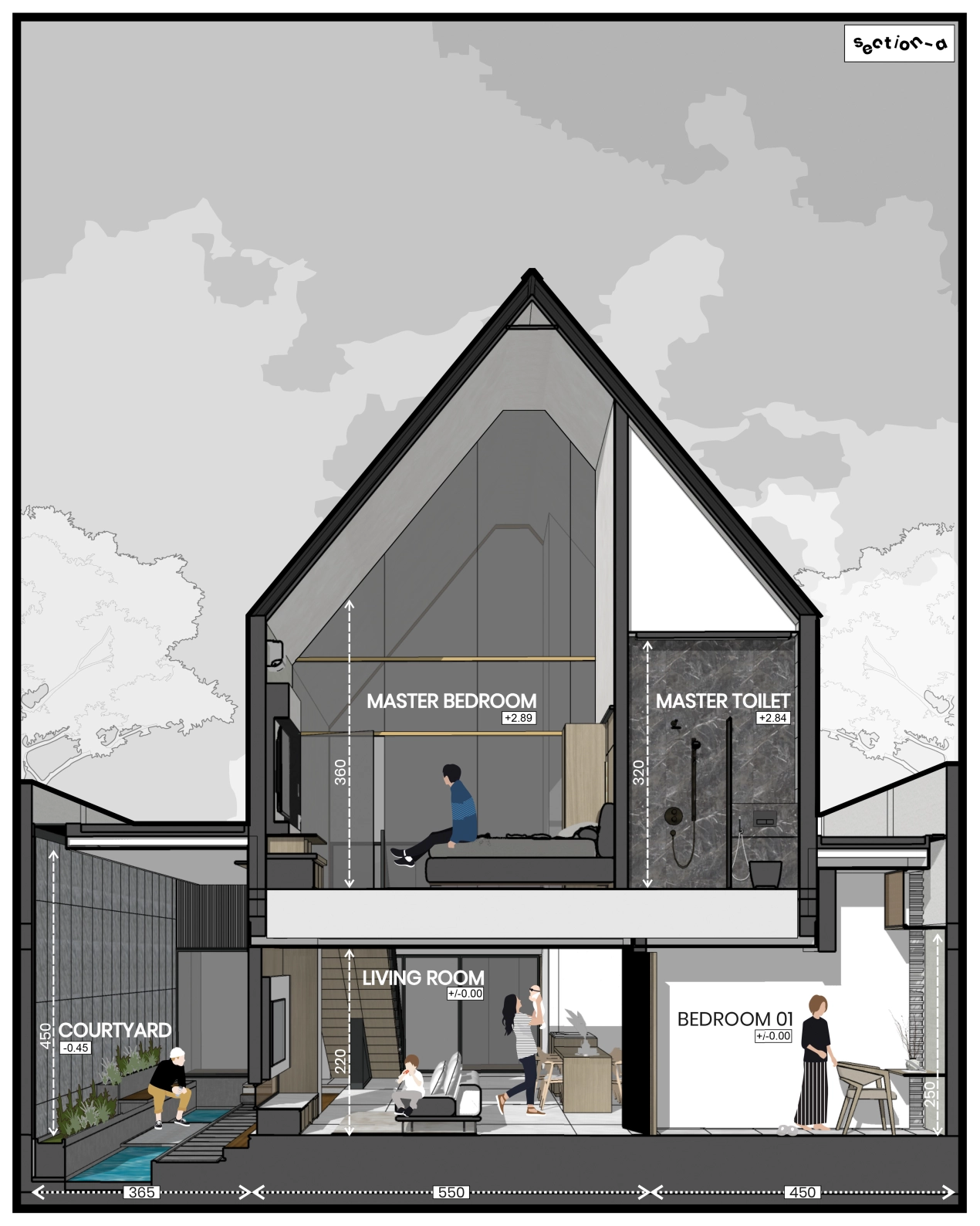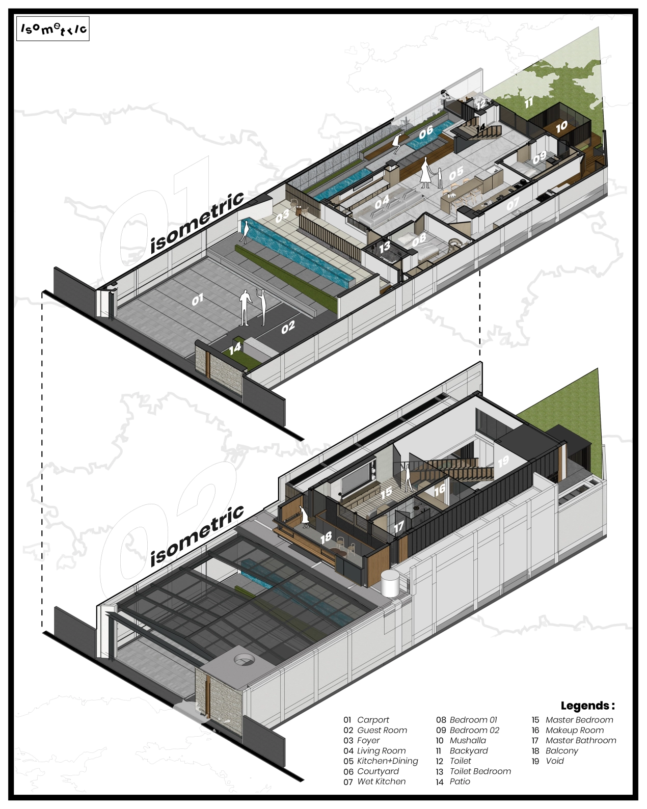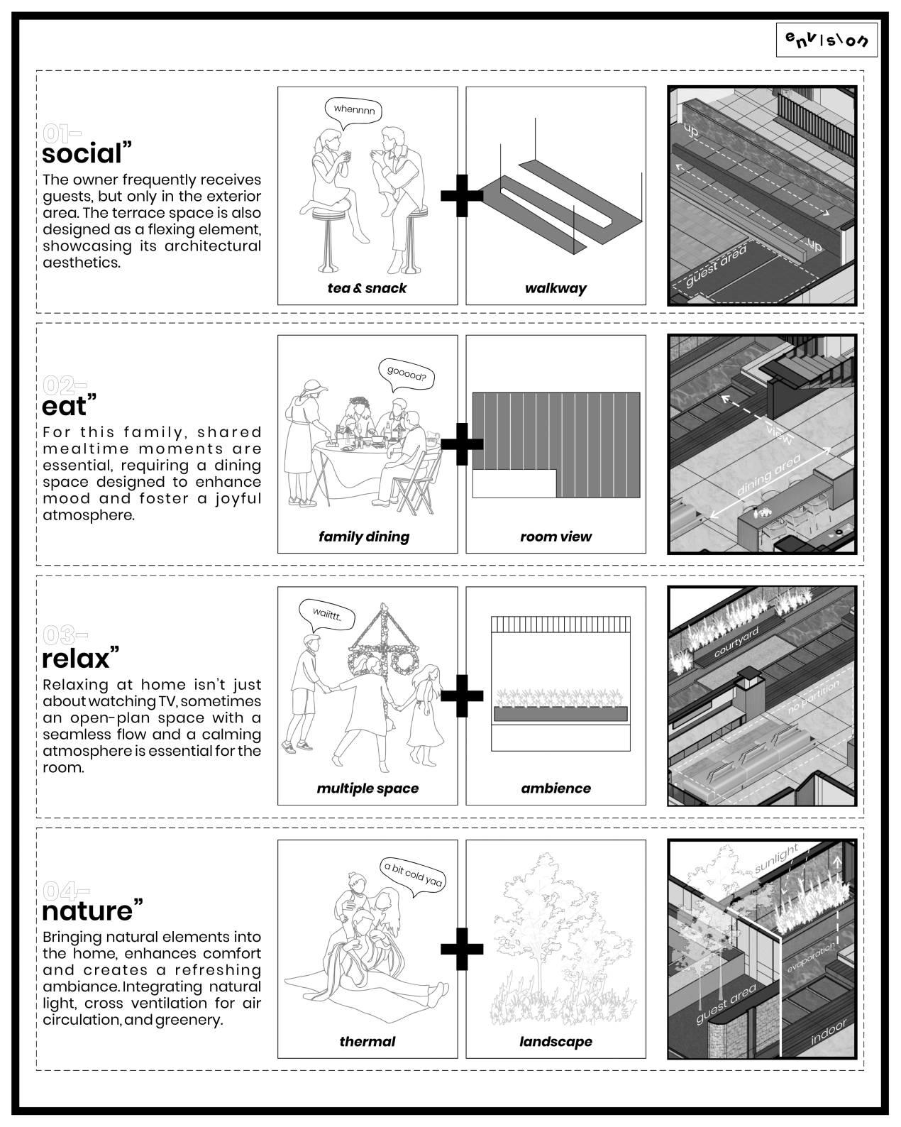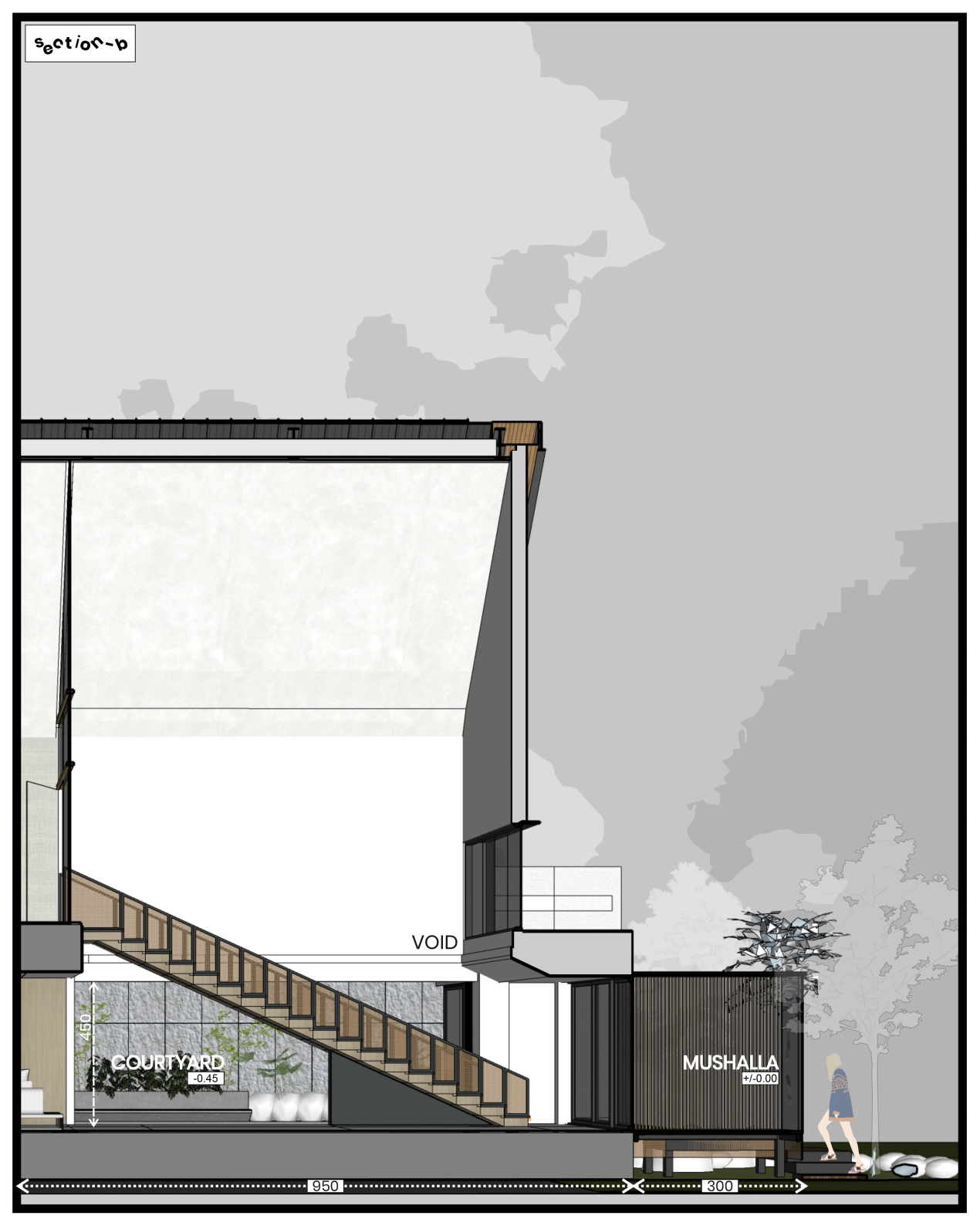 Spatial transitions such as ramps and integrated vegetation add a dynamic and organic touch to the design. These elements create a seamless flow between spaces, enhancing the user experience.