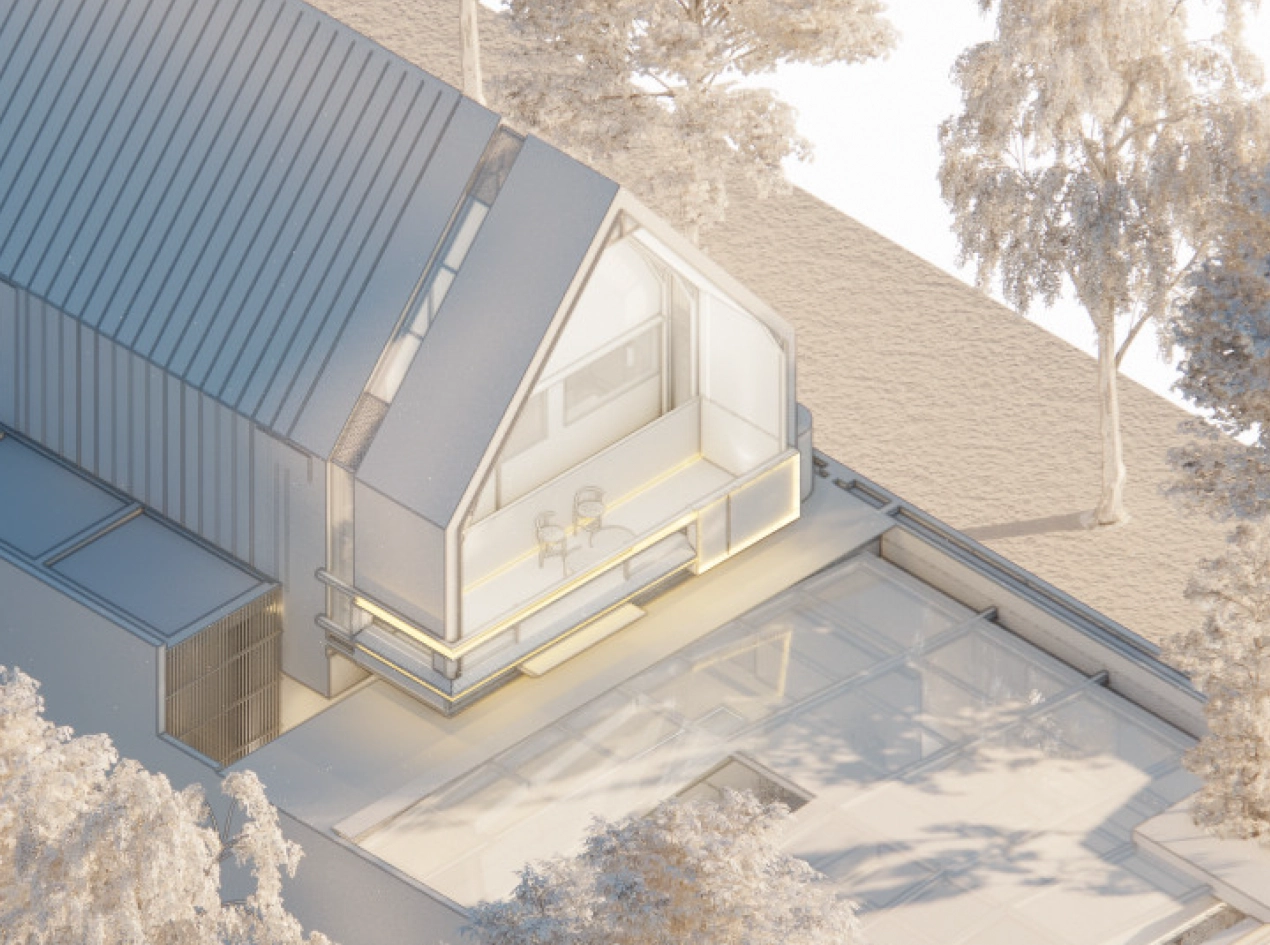 The color palette is warm, creating a cozy and intimate atmosphere. The large central void serves as a striking focal point, enhancing spatial openness while allowing natural light to flow seamlessly, strengthening the connection between different levels and spaces.