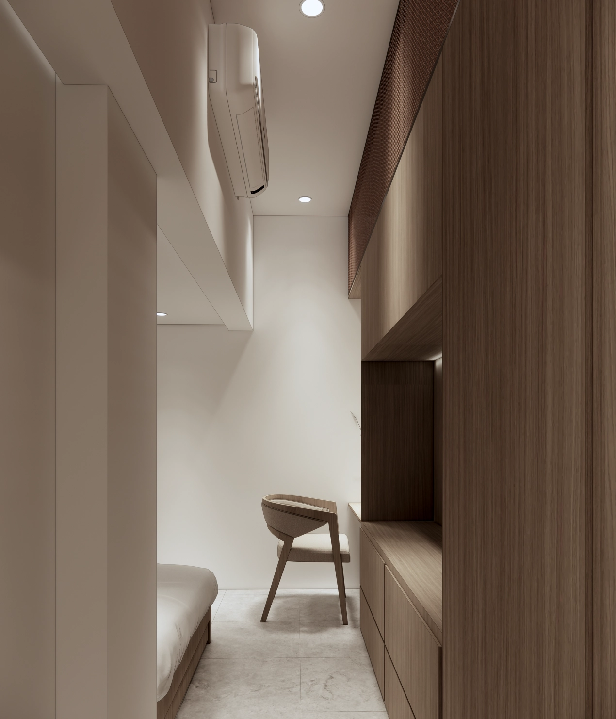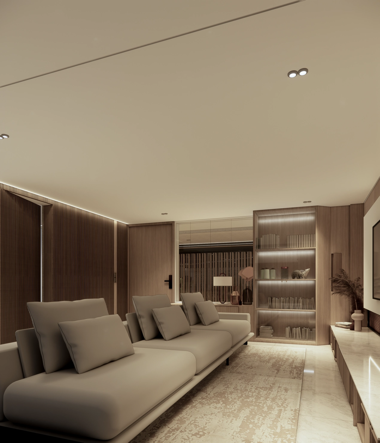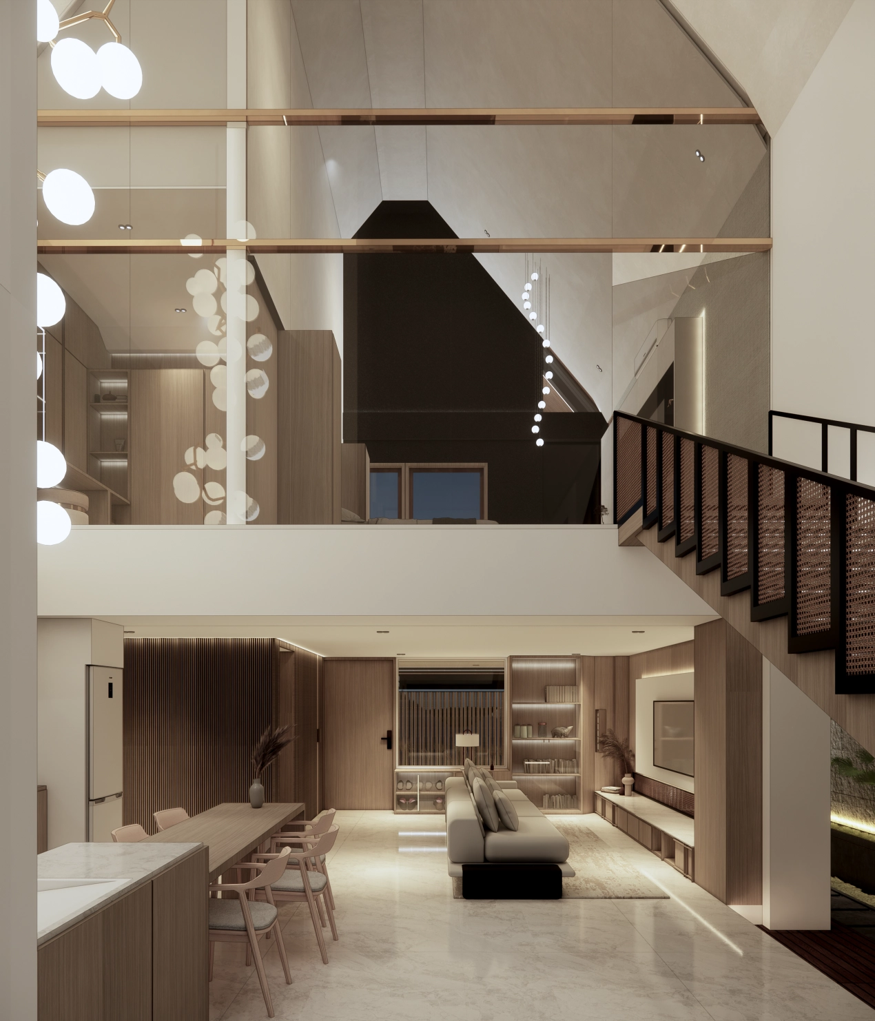 The color palette is warm, creating a cozy and intimate atmosphere. The large central void serves as a striking focal point, enhancing spatial openness while allowing natural light to flow seamlessly, strengthening the connection between different levels and spaces.
