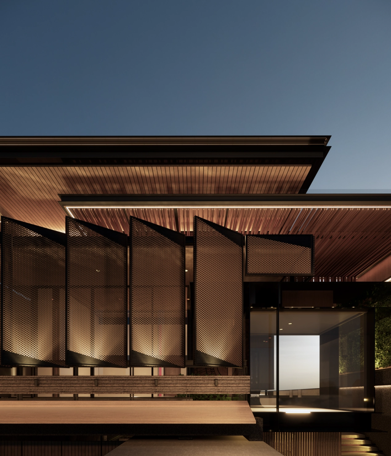 The extensive use of wood paneling on the soffits and ceiling adds warmth and texture, complementing the minimalist yet elegant form of the building. Integrated LED strip lighting accentuates the architectural lines, reinforcing the sophisticated and inviting atmosphere at night.