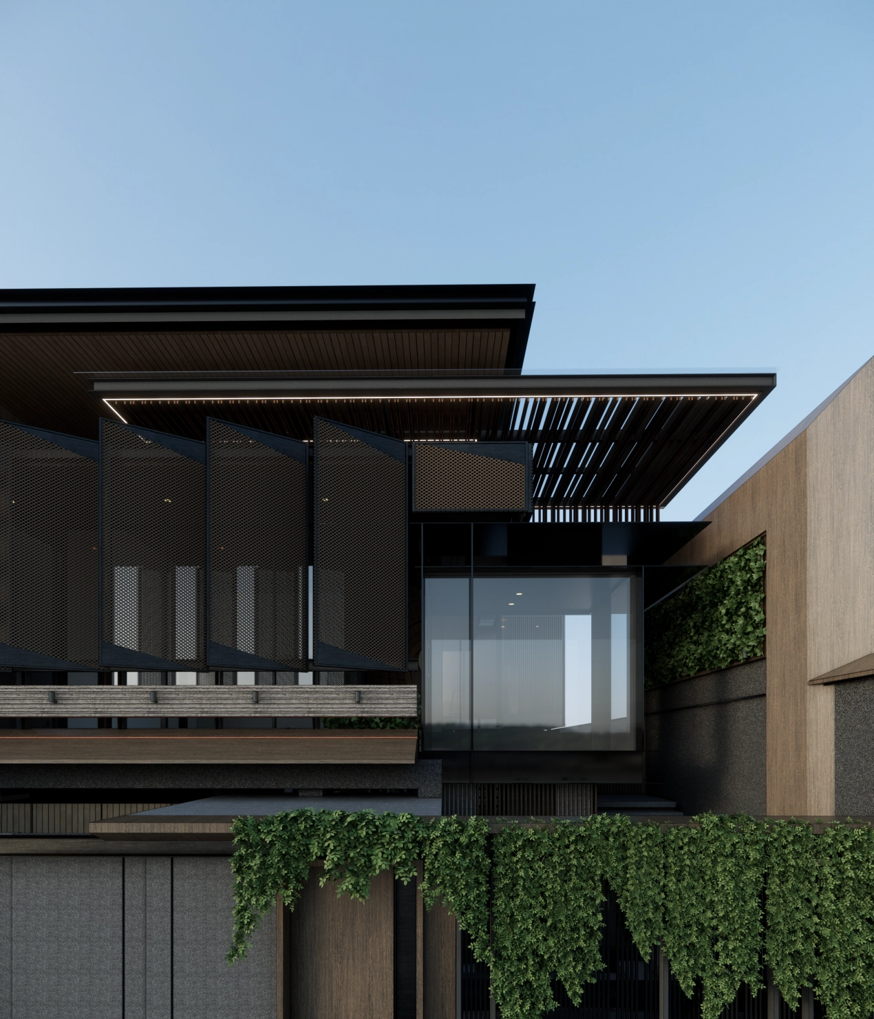 The architectural design embodies contemporary tropical concepts, integrating modern aesthetics with climate-responsive features. The structure features large overhangs, perforated metal screens and lush greenery, all of which contribute to the passive cooling and shading key elements of tropical architecture.